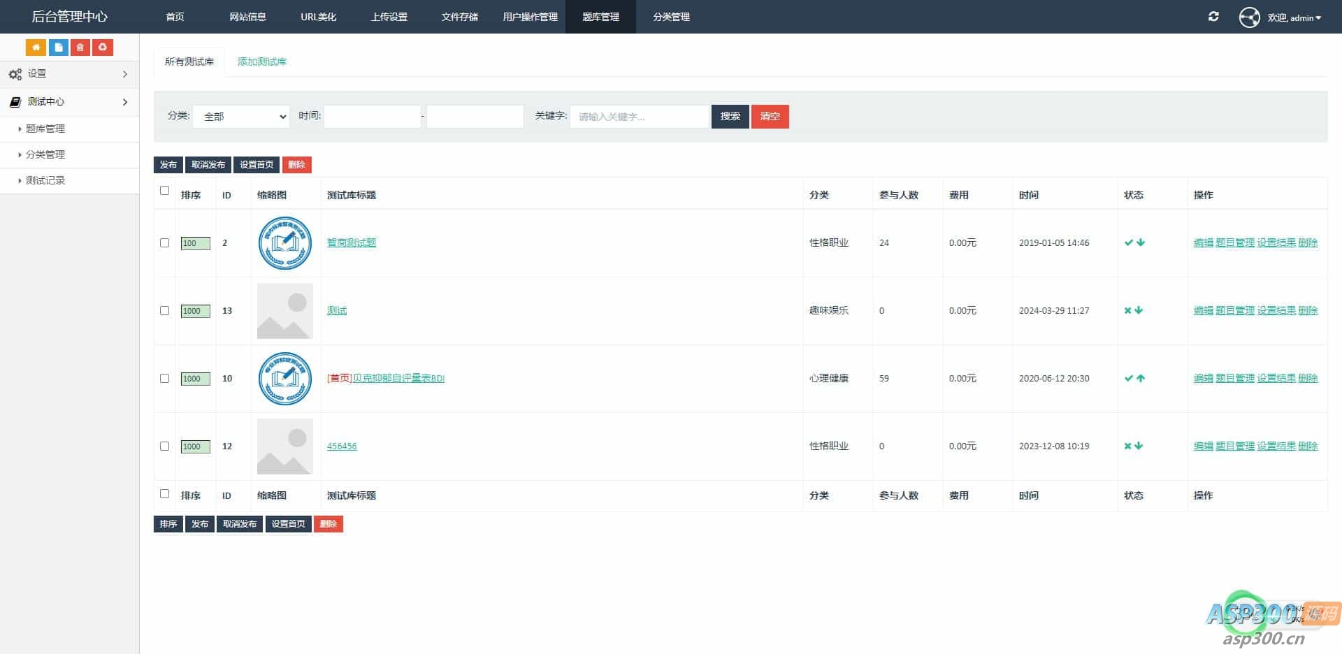 5、功能介绍:后台可以添加多题,多选项,按分值区间设置测评结果,没有专门会员注册的功能,