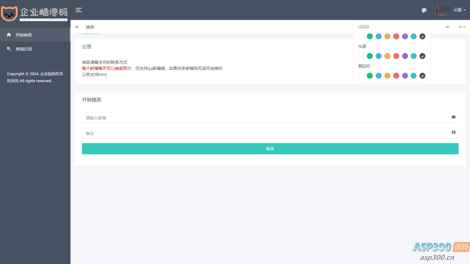 支持邮箱验证抽奖账户,支持自定义公告。
